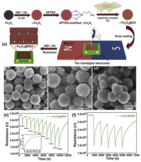 (a) Production process of γ-Fe2O3@RGO-based gas-sensing devices; SEM images of (b) γ-Fe2O3 nanospheres, (c) γ-Fe2O3@GO core-shell hybrids, and (d) γ-Fe2O3@RGO-200 core-shell hybrids; (e) variation in sensor resistance under diverse concentrations of NO2 in real time; and (f) the response replicability under 50 ppm NO2. Reproduced with permission from [158].