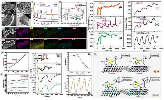 To further enhance the detection limits of gas sensors into the ppm range (trace detection), reduce their operational temperatures (lower power consumption), and improve their suitability for use in exceptional situations (potentially flammable and explosive settings), composites of graphene with other materials such as CPs and TMOs have been used. In some cases, ternary composites are developed, where graphene hybrids are produced with two other sensing materials simultaneously, where the overall performance can be improved significantly when compared with sensors manufactured using individual sensing materials. In a recent study by Zhou et al., rGO, N-doped MXene (Ti3C2Tx), and polyethyleneimine (PEI) ternary hybrids (rGO/N-MXene/PEI) were used as active materials for CO2 detections and displayed exceptional sensing performances. By using this hybrid composition, excellent sensing operations were achieved with outstanding detection limits of 8ppm at room temperature (20 °C). This was attained by optimizing various parameters with a PEI concentration of 0.01 mg/mL and an RH of 62%. Experimental results revealed that along with the extraordinary sensing performance of rGO, layered N-MXene offered an abundance of active sites for CO2 and water co-adsorption, whereas PEI polymers were suitable for the binding of CO2 molecules, resulting in induced appreciable density variation of charge carriers via proton-conduction behaviour [164]. Figure 19 shows various physical characteristics as well as the electrochemical performance of rGO/N-MXene/PEI hybrids as the active material for CO2 sensing application.