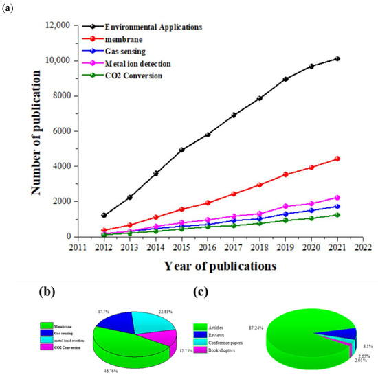 (a) Publication trend of graphene synthesis techniques from 2010 to 2021, (b) Percentage publications for each graphene synthesis techniques, (c) Type of publications of the graphene synthesis techniques. All self-extracted from Scopus (www.scopus.com) (accessed on 11 September 2022).