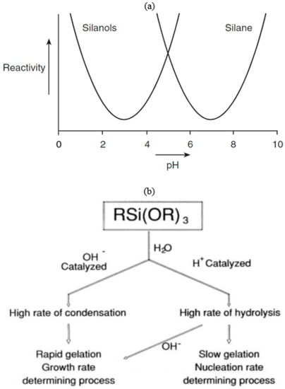 The majority of silanes (with the exemption of aminosilanes) are used for surface treatments under acid-catalyzed conditions, where the rate of hydrolysis is considerably greater than that under the base-catalyzed hydrolysis condition, and it is minimally affected by other carbon-bonded substituents [19]. The hydrolysis is headed by protonation of the alkoxy group [19,25]. In both acid- (Figure 2a) and base-catalyzed (Figure 2b) systems, during hydrolysis, the alkoxy group is replaced with the hydroxyl with a pentacoordinate transition state [26]. The influence of pH on the stability of the alkoxysilanes and the formed silanol’s stability are different [27]. Silanols are most stable at pH around 3, and their reactivity increases when pH is lower than 1.5 or higher than 4.5 (Figure 3a) [27]. The dependency of the hydrolysis and condensation of alkoxysilanes on the pH is different, though acids and bases catalyze both processes [28]. When the reactions are base-catalyzed, gelation is fast due to the high rate of condensation, whereas, in acid-catalyzed reactions, the rate of hydrolysis is high with slow gelation [28]. Danks et al. [26] reported that the hydrolysis step (acid/base) depends on the stability of the transition state, which is dictated by the relative electron-withdrawing or donating power of –OH versus –OR groups. As a result, the subsequent hydrolysis steps become progressively slower in acidic conditions and faster under the basic conditions.