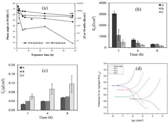 Alibakhshi et al. [49] studied the effect of hydrolysis time and concentration of silane on the corrosion protection of mild steel; tetraethylorthosilicate (TEOS) and trimethoxymethylsilane (TMOMS) were used as silane coatings. EIS results revealed that the coating of the mixture of 50% silanes (TEOS/TMOMS: 50/50 w/w) hydrolyzed for 24 h provided greater corrosion resistance in 3.5% NaCl solution, due to the hydrophobic nature of the coating and better bonding with metal surface and formation of stable film as supported by SEM. The highest corrosion resistance was observed after 1 h of exposure, after which the resistance gradually dropped (as shown in Figure 6a), presumably due to the development of conductive pathways for the electrolyte diffusion through the coating. The phase angle values were more negative in the high-frequency regime for the silane coating with 24 h of hydrolysis compared to 48 h of hydrolysis, suggesting the better protection behavior of the former.