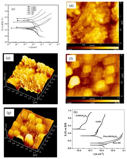 Among the various oxides employed in coating applications, alumina is widely used as an additive for improving the wear and corrosion resistance of coatings, since it is inexpensive, chemically inert and thermally highly stable [70]. Ruhi et al. [71] developed sol–gel alumina coatings on the zinc-phosphated mild steel, followed by sintering at 300, 400 and 500 °C. A high magnification SEM micrograph showed a rough but crack-free coating developed at 300 and 400 °C (Figure 7a for the coating developed at 400 °C). However, numerous cracks were observed in the coating sintered at 500 °C (Figure 7b) due to loss of plasticity as a result of the elimination of the organic part, as detected by FTIR analysis of the coating. As a result, PDP tests (Figure 7c) revealed that the coating sintered at 500 °C possesses the lowest corrosion resistance. However, the sol–gel coated specimen sintered at 400 °C showed a minimum corrosion current density icorr. Tiwari et al. [72] prepared a conversion coating by coating the mild steel with silica sol and dipping the dried silica sol-coated sample in aluminum oxy-hydroxide sol. Then, the coated sample was heated at 500 °C for 2 h and cleaned with ethanol after cooling. For comparison, the mild steel coated with conversion sol–gel is recoated by dipping it in alumina sol and drying at room temperature for 30 min, followed by heating at 250 °C for 15 min. This coating process is repeated five times, followed by heating at 500 °C for 1 h. AFM micrographs in Figure 7d,e showed that the average roughness (Ra), measured diagonally from a 40 μm × 40 μm area scan, is nearly 110 nm and 25 nm for conversion-coated mild steel (CcMS) and alumina-sol-coated steel (Al2O3/CcMS), respectively. The AFM micrographs also revealed that a layered structure sol–gel coating is orientated in different directions with circular nanoparticles of less than 20 nm diameters (Figure 7d,e). The cluster of particles (≈1 μm size) on the CcMS suggests continuous growth in all directions. In contrast, a uniform alumina sol coating is seen on the steel surface. Small dot-like features can be observed as approximately 300–350 nm diameter agglomerates (Figure 7f,g). Figure 7h shows the polarization behavior of CcMS, CcMS/Al2O3 and bare. The alumina coating on pre-phosphated mild steel (Phos.MSAl2O3) was also shown for comparison. Corrosion current densities (icorr) for CcMS and CcMS/Al2O3 are reduced by about two and five orders of magnitude, respectively, compared to bare MS substrate.