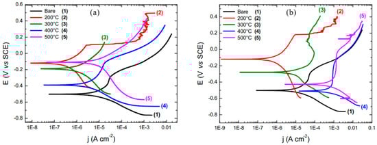 CeO2, a rare earth oxide that has been extensively studied, has attracted the attention in thermocatalysis, electrocatalysis and photocatalysis applications [75]. For the corrosion protection of carbon steel, Carvalho et al. [76] studied the influence of the deposition of cerium oxide films produced from the incorporation of ceric ammonium nitrate and cerium chloride as metal precursors in sol–gel. The effect of using different temperatures and heating rates during thermal calcination was also studied. PDP results showed that cerium deposition enhanced the corrosion resistance of carbon steel, and the Ecorr shifted to the noble direction. The corrosion current densities (icorr) decreased when a 5 °C/min heating rate was used during the prior thermal calcination. The changes are more obvious when the calcination temperatures was 200 °C (Figure 8a,b). They concluded that the sol–gel coatings with ceric ammonium nitrate as a cerium precursor developed at low calcination temperatures and high heating rates are promising as barrier protection for carbon steel and other metallic surfaces.