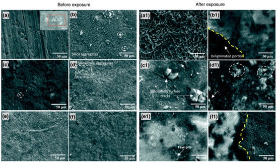 The epoxy–silica hybrid film of (3-glycidoxypropyl)-1,1,3,3-tetramethyldisiloxane and tetraethyl orthosilicate is synthesized for mild steel protection in a solution of 0.6 wt% NaCl and 0.6 wt% (NH4)2SO4 [77]. CeO2 pigments (0.25–2 wt%) are introduced as a filler to improve the barrier protection. EIS results revealed that using CeO2 pigments improved protection against the corrosion of mild steel compared to the unmodified silane coating, suggesting the formation of stable oxide/hydroxides of Ce within the coating network. Figure 9 compared SEM micrographs of coated mild steel before and after immersion in an aerated solution of 0.6 wt% NaCl plus 0.6 wt% (NH4)2SO4 for 14 days. White patches of silica and/or silica/CeO2 aggregates after the thermal curing were observed to be intact on the coated steel (Figure 9a–f). After the two-week immersion, some portions of the coatings are still intact, though micro-cracks and exfoliation were observed in the coating (Figure 9a1–f1). The improvement in corrosion resistance of the coated steel is due to the anticorrosive properties of CeO2 and the pigment enforcing interconnectivity.