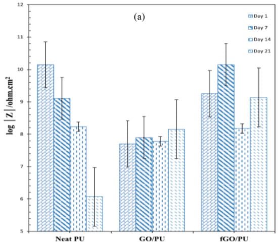 Haghdadeh et al. [84] functionalized the graphene oxide (GO) nanosheets with (3-glycidyloxypropyl) trimethoxysilane to be introduced into the polyurethane (PU) matrix for improving the corrosion resistance and mechanical properties of the composite coating on metals. The corrosion protection properties of the coatings were investigated using salt spray and EIS tests. In the salt spray test, blisters and corrosion spots emerged on both the GO/PU and neat PU coatings after 300 h and 600 h, respectively, that increased with the duration of salt spray. Thus, incorporating the neat GO into the PU matrix was found to be deleterious for corrosion resistance, which was attributed to the presence of many polar groups on the GO sheets and their ability to increase the hydrophilic nature of PU, thereby increasing susceptibility to corrosion. This mechanistic explanation was duly supported by the fact that when PU was added with suitably functionalized GO, i.e., fGO (instead of plain GO), corrosion resistance due to fGO/PU coating improved, which is attributed to the hydrophobic nature of fGO. With fGO/PU coating, considerably fewer corrosion spots and blisters were observed even after 900 h of salt spray. Figure 10a shows the evolution of impedance (|Z|) in the lowest frequency regime (10 mHz), i.e., representation of corrosion resistance, for the neat PU, GO/PU and fGO/PU during immersion for different durations in 3.5 wt% NaCl solution. Corrosion resistance decreased rapidly for the neat PU-coating (Figure 10a). Consistent with the salt-spray test results, the corrosion resistance of GO-containing PU coating (GO/PU) was inferior to the plain PU coating, since GO is known to suffer agglomeration that creates defects in the coating. However, suitably functionalization of GO to develop fGO/PU coating provided considerably improved and durable corrosion resistance, as seen in Figure 10a [84].