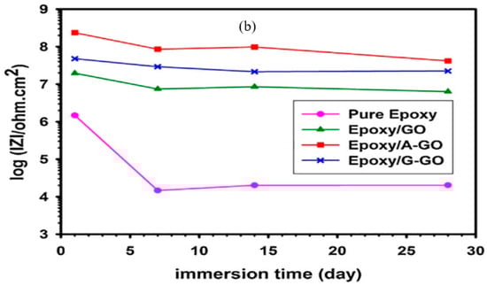 Pourhashem et al. [85] modified 3-aminopropyl triethoxysilane (APTES) and 3-glysidyloxypropyl trimethoxysilane (GPTMS) silanes to create amine and epoxy end-groups and then used the modified silanes to functionalize graphene oxide (GO). The composite coating was applied onto steel. Corrosion resistance of bare, epoxy-coated and nanocomposite-epoxy-coated steel in 3.5 wt% NaCl solution was evaluated. OCP of coatings was evaluated to be positive in the order: epoxy < epoxy/GO < epoxy/G-GO < epoxy/A-GO, i.e., the addition of nanofiller improved the corrosion resistance, which is also corroborated by the corresponding impedance (|Z|) data (Figure 10b). The corrosion resistance decreased with increasing immersion time; however, the decrease is considerably less pronounced for epoxy coatings modified with GO and its derivatives. As seen in Figure 10b, the impedance (|Z|) of steel coated with unmodified (pure) epoxy decreased rapidly from ~106 to ~104 Ω cm2 within 7 days of immersion, before stabilizing. On the other hand, impedance (|Z|) stays reasonably stable in the case of epoxy coatings modified with GO and its derivatives, suggesting their ability to overcome the deleterious effect of porosity and defects of the nanocomposite coating. In another study, Pourhashem et al. [86] investigated epoxy coatings containing graphene oxide (GO) and amino-silane modified GO (A-GO), with various weight fractions (0.05, 0.1, 0.3 and 0.5 wt%), on mild steel 3.5% NaCl solution. They found the corrosion resistance due to the epoxy/A-GO coating to be significantly higher. The optimum GO content was found to be 0.1wt%; at greater contents, GO nanosheets started to suffer agglomeration.