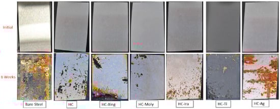 Suleiman et al. [94] synthesized a hybrid sol–gel material (HC) from allyl precursors and functionalized it into hybrid polymeric material incorporated with various organic and inorganic antibacterial agents, i.e., 1,1-dimethylbiguanide hydrochloride (HC-Bing), Irgarol (HC-Ira), MOLY-white 101 (HC-Moly), Ti nanoparticles (HC-Ti) or silver nanoparticle dispersion (HC-Ag). EIS results for the coated samples exposed to plain 3.5% NaCl solution showed that HC, HC-Ira and HC-Moly had considerably higher corrosion resistance, which was supported by icorr data in PDP tests. In contrast, it was HC-Bing and HC-Ti that showed greater resistance to biofouling. As seen in Figure 11, only two hard-shell barnacles were found to become attached to HC-Bing during 6 months of a marine biofouling test, whereas the bare steel substrate suffered heavy biofouling and corrosion. In comparison, no barnacles, polychaetes or deposits were observed on the surfaces of other coatings.