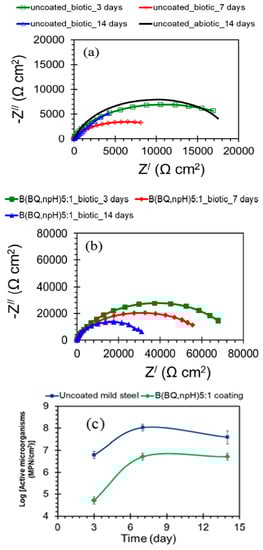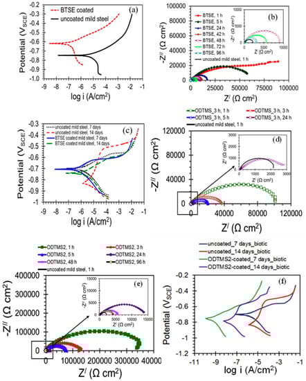Al-Saadi et al. [95] studied the influence of Bis[triethoxysilyl]ethane (BTSE) silane coating on the corrosion resistance of mild steel in an aerobic chloride medium and an anaerobic microbial medium containing sulphate-reducing bacteria (SRB). BTSE coating significantly enhanced the corrosion resistance of mild steel in 0.6M NaCl; the icorr of the uncoated steel was at least 25 times higher than that of the steel coated with BTSE (Figure 12a). EIS results in Figure 12b showed that the impedance of the BTSE-coated steel was 45 times higher than that of the uncoated mild steel. In the presence of SRB, BTSE coating provided little protection to the mild steel substrates as suggested by the more negative Ecorr and the significant increase in icorr after 14 days of exposure to marine environment inoculated with SRB (Figure 12c). They reported that the limited improvement provided by BTSE coating in the presence of SRB is due to the absence of any antimicrobial functional group in this silane.
