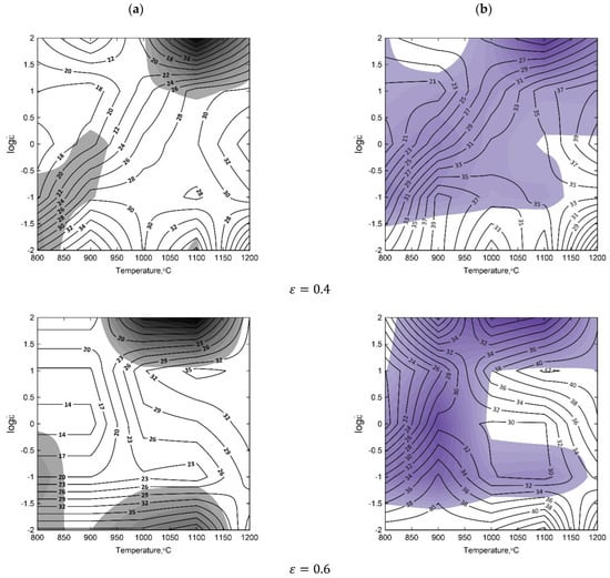 Basing on the obtained flow–stress curves, the processing maps for various temperatures and for the true strains of ε = 0.4, 0.6, 0.8, and 1 were elaborated (Figure 3). The numbers on the contour lines signifies the percent efficiency of the power dissipation . They are directly related to the process of microstructural evolution of the material, such as DRX, grain coarsening or DRV [45,46,47]. The areas of the flow instability characterize inhomogeneous deformation, which should be avoided when designing hot processing conditions.