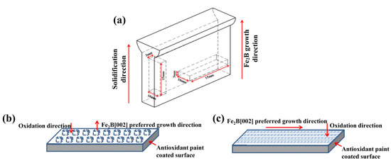 Schematic diagram of different oriented boride oxide samples: (a) Schematic diagram of sample position for high-temperature oxidation; (b) Fe2B// samples; (c) Fe2B⊥ samples.