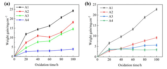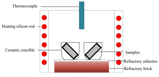 The static oxidation experiment method followed the Chinese national standards (GB/T 13303–91) [35]. The static oxidation tests were carried out in a box-type resistance furnace in air at 1073 K (with ±3 K) for a total oxidation time of 100 h. [32]. The static oxidation test was maintained at 20 h, 40 h, 60 h, 80 h and 100 h. After the oxidation test, the samples were cooled down in the furnace and then the weight gains were measured at room temperature on an electronic balance with a precision of 0.01 mg. In order to ensure the spalling of the scales, the samples were put into a crucible and the weight gains of the spalling scale after different oxidation durations were measured and calculated together according to GB/T 13303–91. Three repeated tests were conducted to obtain the average weight gain. The equipment used for static oxidation experiments is illustrated in Figure 3.