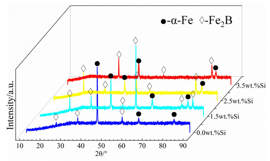Figure 4 shows the scanning electron microstructure images of the test alloys in the as-cast condition with different Si contents. From Figure 4, it can be seen that all the test alloys formed a metallic matrix and eutectic boride [36,37,38]. Clearly, the microstructures of the DS Fe–B alloys containing various Si addition showed good orientation effects. The columnar gray Fe2B were arranged with long rods with a preferred growth orientation of columnar Fe2B [002] crystal orientation [7,34]. Furthermore, the gray-white α-Fe matrix was distributed among the lamellar structures of columnar Fe2B, exhibiting dual-phase oriented microstructures of the DS Fe–B alloys (Figure 4). Additionally, the lamellar space of the columnar Fe2B was greatly refined by Si addition. Figure 5 shows the XRD patterns of the as-cast DS Fe–B alloys with different Si contents. It can be seen that the as-cast microstructures of the longitudinal section of DS Fe–B alloy mainly comprised Fe2B (36-1332) indexed with lots of strong peaks as well as the presence of some α-Fe peaks (06-0696) [32,39]. Obviously, the increasing Si addition resulted in the vanishing peaks of some small diffraction angles and strengthened peaks of large diffraction angles for oriented Fe2B, which may be influenced by the various oriented crystal planes of Fe2B grain in its lateral grain plane (i.e., prismatic plane of Fe2B with strong faceted crystal growth). Meanwhile, with the increase in Si content, there was no new phase in the DS Fe–B alloys, which indicates that Si just dissolves into the matrix and refines the lamellar structures of α-Fe and Fe2B [34].