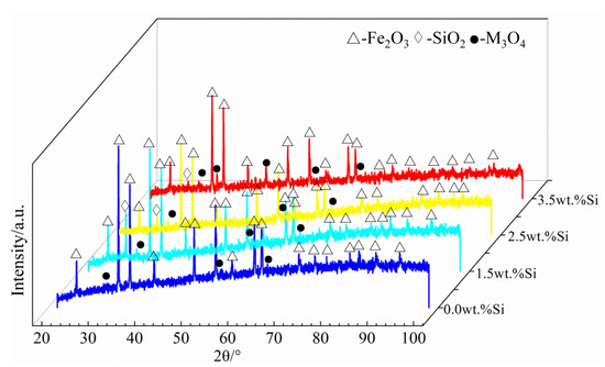The Fe2B// oxidation surface morphologies of the oxide scales formed at 1073 K for 100 h are shown in Figure 7. It was observed that the oxide film on the surface of the DS Fe–B alloy without Si was relatively loose and rough with some holes and cracks, and more parts of the surface were cracked and wrinkled, which indicates that the oxide film was very easy to crack and peel off from the substrate (Figure 7a). From Figure 7b–d, with the increase in Si content, the oxide film of the DS Fe–B alloy became fairly compact, uniform and smooth. Furthermore, the emerging cracks and holes on the scales were gradually filled and vanished. Obviously, a large number of cracks and holes formed on the surface of sample A1 may provide fast channels for the diffusion of oxygen ions and thus promote the constant oxidation process [5]. With an increase in Si content, the inside of the oxide film became denser, preventing the outward diffusion of the internal matrix elements, and the surface became flatter. From Figure 8, the surface oxides of sample A1 were composed of Fe2O3, M3O4 (M = Fe, Cr) [41]. It is interesting to note that a small amount of SiO2 was obtained on the surface of the oxide film, which indicates that part of the Si may segregate at the substrate–scale interface and react with oxygen ions to form the inner SiO2 layer.