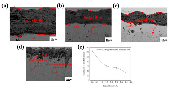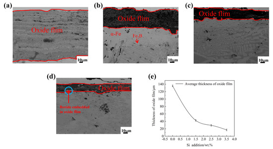 The BSE micrographs of the cross-section of Fe2B// samples oxidized for 60 h at 1073 K: (a) alloy A1, (b) alloy A2, (c) alloy A3, (d) alloy A4, (e) the thickness of cross-sectional oxide film.