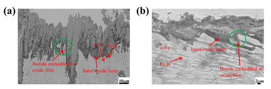 Different from Figure 14b, in the Fe2B⊥ sample the Fe2B [002] orientation was parallel to the oxidation direction and was partly embedded into the oxide film obliquely. Due to the blocking effect of borides, Si4+ cannot continue to diffuse outward through the inner interface and is mainly concentrated and enriched at the bottom of the oxide film to form a SiO2 oxide layer, which depends on the O2− inner-diffusion controlled process. Therefore, the overall anti-oxidation performance of the Fe2B⊥ sample was better than that of the Fe2B// sample owing to the combined effects of Si content and Fe2B orientation.