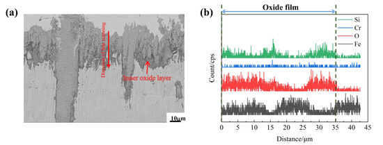 Figure 12 shows the cross-sectional line scanning analysis of the Fe2B// sample of the A4 alloy oxidized for 60 h at 1073 K. The thickness of the oxide film was about 35 μm. From Figure 8 and Figure 12b, the oxide film was composed Fe2O3, Fe3O4 and SiO2 oxides. Fe2O3 and Fe3O4 mainly exist in the outer oxide layer, and an obvious internal oxidation is found at the boundary of substrate and oxide film (black zone at the bottom of the oxide film), it can be found that the inner oxide layer is a SiO2 layer. This SiO2 oxide scale is not only compact and continuous, but also presents strong and perfect adhesion to the metallic substrate [31,33], which may well hinder further O2- diffusion into the matrix [31,33].