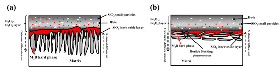 Schematic diagrams of high-temperature oxidation mechanisms: (a) Fe2B// A4 sample, (b) Fe2B⊥ A4 sample.