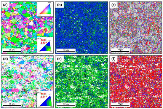 The inverse pole figure, KAM and GB maps for the (a–c) as-received (AR) and (d–f) HRDSR samples. In the GB map, low-angle boundaries (2–5°) are in red, intermediate angle boundaries (5–15°) are in green and high-angle boundaries (>15°) are in blue.