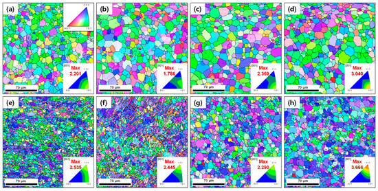 The IPF maps for the AR samples (a) annealed for 5 min at 873 K, (b) annealed for 5 min at 873 K and then aged at 523 K for 16 h, (c) annealed for 120 min at 873 K, (d) annealed for 120 min at 873 K and then aged at 523 K for 16 h. The IPF maps for the HRDSR samples (e) annealed for 5 min at 873 K, (f) annealed for 5 min at 873 K and then aged at 523 K for 16 h, (g) annealed for 120 min at 873 K, (h) annealed for 120 min at 873 K and then aged at 523 K for 16 h.