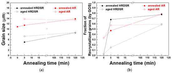 (a) The grain size of the AR and HRDSR samples before and after heat treatment. (b) The fraction of recrystallized grains in the AR and HRDSR samples before and after heat treatment determined using GOS.
