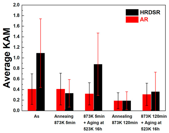The average KAM values of the AR and HRDSR samples after annealing or annealing plus aging.