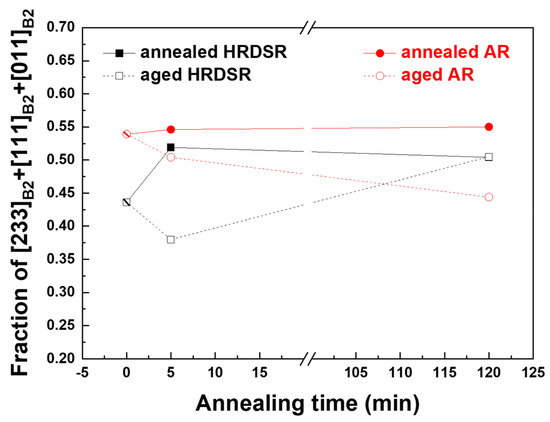 The total fraction of grains with the texture components of [233]B2//RD, [111]B2//RD and [011]B2//RD texture components for the AR and HRDSR samples after annealing or annealing plus aging.