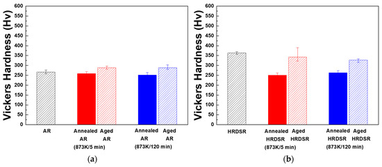 The Vickers hardness of the (a) AR and (b) HRDSR samples after annealing or annealing plus aging.