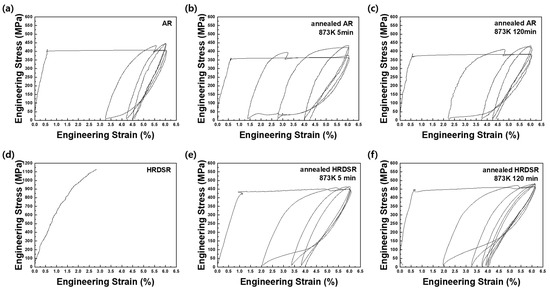 Superelastic cyclic tests up to the strain of 6% for (a) the AR sample, (b) the AR sample annealed at 873 K for 5 min, (c) the AR sample annealed at 873 K for 120 min, (d) the HRDSR sample, (e) the HRDSR sample annealed at 873 K for 5 min and (f) the HRDSR sample annealed at 873 K for 120 min.