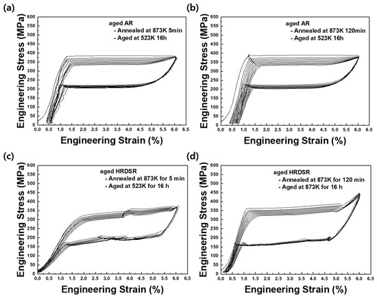 To evaluate the superelastic properties of the AR, HRDSR, annealed AR, annealed HRDSR, aged AR and aged HRDSR samples, a cyclic test through tensile loading–unloading was performed. A 6% strain was applied at a test temperature of 298 K.
