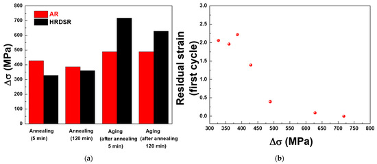As the aged HRDSR samples do not have a favorable texture compared to the aged AR samples, the superior superelasticity of the former should originate from their microstructures. Tong et al. [41] proposed that the difference between the yield strength of B2 and the critical stress for the phase martensitic transformation (Δσ) is related to the recovery strain, which is equal to the applied strain minus the residual strain. Here, the yield stresses for the annealed and aged AR and HRDSR samples were estimated based on their Vickers hardness data using the relation of [42], where is the yield stress (MPa) and is the Vickers hardness (kg/mm2). Figure 16a shows the Δσ calculated using the values calculated from the data and the critical stresses for the martensitic transformation measured from the tensile tests in Figure 13 and Figure 15. The aged HRDSRed sample (after annealing for 5 min) exhibits the largest Δσ. This is because the critical stress for phase transformation from R to B19′ is lower than that from B2 to B19′ and the yield strength is high due to effective grain refinement and particle strengthening.