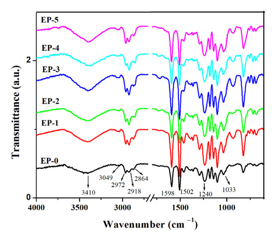 FTIR spectroscopy was used to investigate the structure of epoxy thermosets. In the FTIR spectra of the samples (Figure 3), characteristic absorption bands appeared at 3700–3100 cm−1 (N–H and O–H resulting from the crosslinking reaction of epoxy resin with the hardeners DDS and BPH), 3049 cm−1 (C–H aromatic), 2972, 2818 and 2864 cm−1 (aliphatic stretching vibration), 1598 and 1502 cm−1 (aromatic –C=C– stretching vibration), and 1240 and 1033 cm−1 (C6H4–O–CH2 asymmetric and symmetric stretching vibration, respectively).