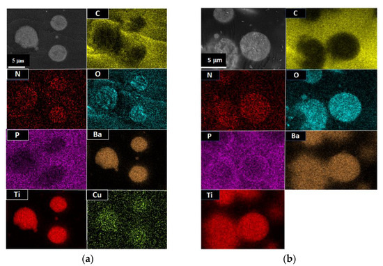 The EDX mapping of EP-3 (Figure S7) revealed the distribution of phosphorus and Cu atoms, suggesting a uniform distribution of the segments coming from BPH and a homogenous distribution and a good compatibility of hyperbranched phthalocyanine polymer HPc with epoxy matrix. The EDX mapping of EP-4 (Figure 5a) shows the uniform distribution of phosphorus and Cu atoms. The distribution of Ba and Ti atoms in the epoxy matrix, however, suggested that some agglomeration of BaTiO3 nanoparticles appeared. In the EDX diagram of EP-4 (Figure 6), the peak at 4.5 KeV revealed the existence of barium and titanium atoms. The presence of sulfur, phosphorus, and copper atoms can be also observed in the EDX diagram.