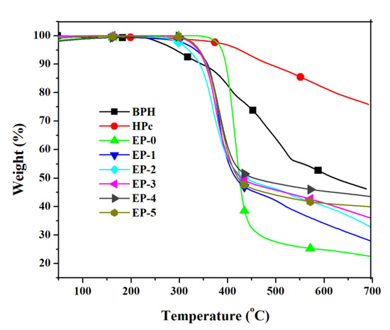 Differential scanning calorimetry measurements were performed to obtain information regarding the expected glass transitions of the epoxy thermosets. All the DSC curves exhibited classical Tg’s, with decreasing values, as the composite systems became more complicated (Table 2, Figure S5b). The Tg values were situated in the temperature range of 158–201 °C. The EP-0 exhibited the highest Tg value of 201 °C. This is because EP-0 does not contain additives and the cross-linking density is high. The use as hardeners of BPH together with DDS decreased the Tg values, especially for EP-2, probably because of the bulkiness of the molecule causing steric hindrance for formation of the network. The presence of HPc and BaTiO3 decreased the Tg values when compared with EP-1. Thus, in the case of EP-4 and EP-5, the presence HPc and BaTiO3 led to a decrease in the crosslink density, which decreased the Tg values. In addition, the reduction in cross-linking density in the case of phosphorus containing thermosets could be due to the lower reactivity of phenolic groups of BPH.