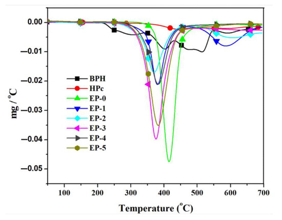 DTG curves of epoxy thermosets, BPH, and HPc.