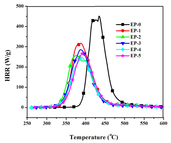 The HRC can be calculated from MCC tests and can be used to classify the flammability of the materials [42]. A low value indicates a low flammability of the samples [43]. The HRC of EP-0 was 776.03 J/(g*K). A substantial decrease in HRC values appeared by the introduction of bisphenol BPH (EP-1 and EP-2). The HRC value decreased further by the introduction of HPc in the case of EP-3 (HRC = 287.79 J/(g*K)). The lowest values of HRC were achieved for EP-4 and EP-5 containing BaTiO3, probably because of a lower concentration of epoxy resin in the system.