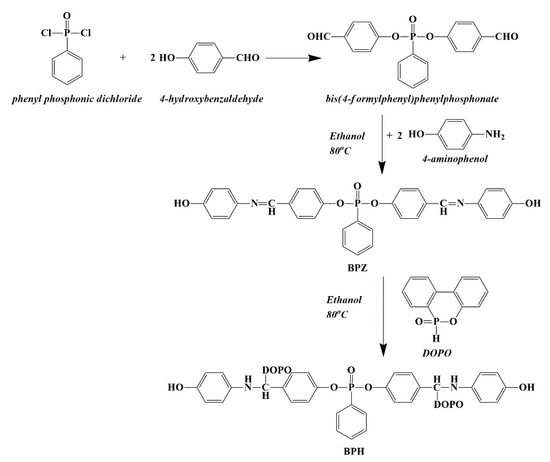 Bis(4-formylphenyl) phenylphosphonate (3.66 g, 0.01 mol), 4-aminophenol (2.18 g, 0.02 mol), and 30 mL ethanol were introduced into a three-necked flask equipped with a condenser and magnetic stirrer. The reaction mixture was stirred at reflux temperature under nitrogen atmosphere for 5 h. DOPO (4.32 g, 0.02 mmol) and 8 mL ethanol were introduced into the flask and heating was continued at reflux temperature for 18 h. To yield 85% of the final product, BPH (Figure 2), the resulting precipitate was filtered, washed with water for several times, and dried under vacuum at 50 °C for 5 h.