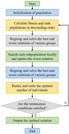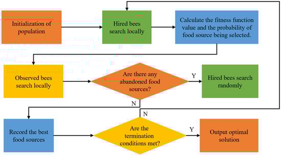 - If a food source is still not improved after iteration of the set number of cycles, the corresponding hired bee will become an observed bee, and a new food source will be generated to replace the abandoned food source:The generation of new food sources is conducive to ensuring the diversity of the population and improving the probability of finding the optimal solution. A flow chart of the ABC algorithm is shown in Figure 11.
