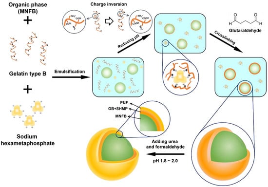 Gelatin from bovine skins (type B, bloom ~225 g) was purchased from Sigma-Aldrich (St. Louis, MO, USA), and sodium hexametaphosphate was purchased from Daejung Chemicals & Metals Co., Ltd. (Gyeong-gi, Korea) and used as shell materials. Methoxynonafluorobutane (MNFB, Sigma-Aldrich, Burlington, MA, USA) was us ed as core material. The physicochemical properties of MNFB are shown in Table 1. Urea (Junsei Co., Tokyo, Japan) and formaldehyde (37%, Daejung Chemical & Metals Co., Ltd., Gyeonggi-do, Korea) were used as coating materials. Polyvinylpyrrolidone (K30, Daejung Chemical & Metals Co., Ltd., Gyeonggi-do, Korea) was used as an emulsifier. Glutaric aldehyde (50 wt%) was purchased from Daejung Chemicals & Metals Co., Ltd. and used as a crosslinker. Hydrochloric acid solutions (0.1 M and 1 M) were purchased from Daejung Chemical & Metals Co., Ltd. and used to adjust the pH value of the solution.