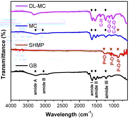 The surface functional groups of the prepared MC samples (MC and DL-MC) were confirmed by FTIR analysis. The FTIR spectra of GB, SHMP, MC and DL-MC are shown in Figure 5, and their representative characteristic peaks were well observed. GB showed typical vibration peaks corresponding to amide A (3270~3330 cm−1), amide B (3070 cm−1), amide I (1630 cm−1), amide II (1520 cm−1) and amide III (1200–1230 cm−1), respectively. Both MC and DL-MC showed similar patterns of FTIR spectra with typical peaks related to amide A (3280 cm−1), amide B (3070 cm−1), amide I (1630 cm−1), amide II (1520 cm−1) and amide III (1200–1230 cm−1), respectively. This indicated that both microcapsule samples had polymer shells successfully fabricated with GB [28,29,30,31]. SHMP showed typical peaks related to vibration of P=O (1240 cm−1), P-O (1070 cm−1) and 867 cm−1 (P-O-P), respectively. The MC sample showed an identical FTIR peak associated with P-O-P vibration at 867 cm−1 [32]. However, P-O-P-related vibration was not clearly observed in the DL-MC sample. It is possible that this was attributed to the formation of a relatively thick UF resin layer on the gelatin layer, resulting in a weak related signal SHMP compared to other substances. The DL-MC sample exhibited new peaks corresponding to the asymmetric stretching of C-O-C (1130 cm−1), C-C-O and C-H stretching mode of CH2OH at 1020 cm−1, 1380 cm−1, respectively, where they can typically be observed in UF resin [31,33,34,35].