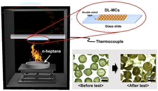A laboratory scale fire suppression test for DL-MC was performed in a container shown in Figure 9. Adhesive tape was attached to the glass slide with dried DL-MCs (1 g), and a thermocouple was installed on the back of the glass slide. N-heptane (50 mL) was used as the fuel, and the fire suppression test was started by ignition. Figure 9 shows that DL-MCs were deformed after the test due to the release of the core substance, MNFB.