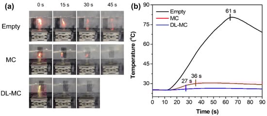 Digital images of a laboratory scale fire suppression test with time intervals (every 15 s) and profiles of temperature changes are shown in Figure 10a,b, respectively. In the case of an empty plate, the fire was extinguished naturally after 61 s because all the fuel had been exhausted. As shown in Figure 10b, the temperature increased drastically in less than 61 s and then gradually decreased due to the removal of the heat source. When we used the fire suppression microcapsules, complete extinction toward fire was achieved in 36 s and 27 s for MC and DL-MC, respectively. The fire flame was exposed to microcapsule samples, and it was possible to increase the local temperature. Then, as the outer shell was torn, the internal extinguishing agent was released to suppress the fire. It was confirmed that the range of the temperature rise was small compared to the empty plate because the MNFB was vaporized and simultaneously absorbed the surrounding heat. In particular, when DL-MC was applied as a fire suppression agent, it could be seen that the fire flame was almost extinguished for about 15 s. This should be because DL-MC contains more extinguishing agents and has longer storage performance compared to MC. As shown in Figure 10b, more internal substance can be released in this way, and more MFNB is evaporated, resulting in more heat absorbed and negligible temperature changes. Therefore, DL-MC proved to be more effective in initial fire suppression compared to the single-layered microcapsule samples.