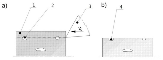 The formation of surface defects can be a result of internal defects or the removal of a layer of material (Figure 2). The workpiece has internal defects in the material before machining. When the cut layer is removed with a tool blade, the material defects are made visible on the machined surface as surface defects. Owing to the way they are manufactured, polymer composites are one example of materials that are prone to the formation of a higher number of internal defects. Improper bonding conditions of the reinforcing phase can affect the number of internal defects formed, and thus the strength of the composite material, its resistance to operating conditions, or damage to the final product [5]. There exist numerous methods for detecting both surface and internal defects. Among them are nonlinear techniques that use the cutting force signal for defect detection in milling, turning, or drilling processes. When the cutting edge passes through a surface defect, this causes a sudden change in the cutting conditions, which is reflected in the cutting force signal. Recurrence plots and recurrence quantification analysis are used to detect the areas where the cutting force signal is disturbed by the presence of surface defects [6,7,8].