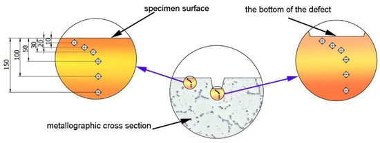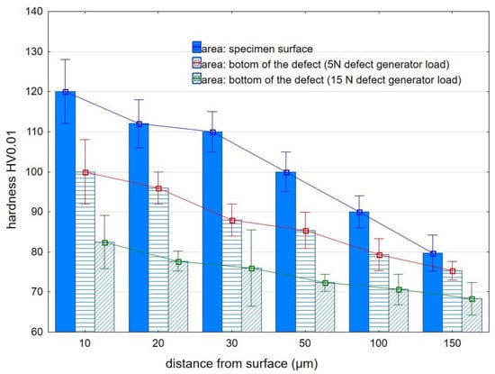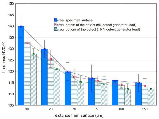 Microhardness was measured on metallographic specimens at the distances of 10, 20, 30, 50, 100, and 150 µm from the surface of the sample, as well as (using the same distances) from the surface of the bottom of the defect. The minimum distance between imprints was equal to 4 imprint sizes.