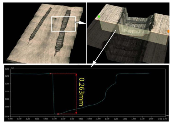 Figure 7 shows the method of measuring the depth of surface defects formed in AZ91 HP alloy after the passage of the defect generator with a load of 15 N. The software of the microscope (the assembly function of a series of images) allows us to make a model and measure the depth in a section perpendicular to the surface of the test object. The average width of the grooves in AZ91 HP magnesium alloy inducted by the defect generator was 460 µm and 780 µm for a load of 5 N and 15 N, respectively. In turn, the average width of the grooves in EN AW-2024 aluminum alloy inducted by the defect generator was 200 µm and 375 µm for a load of 5 N and 15 N, respectively.