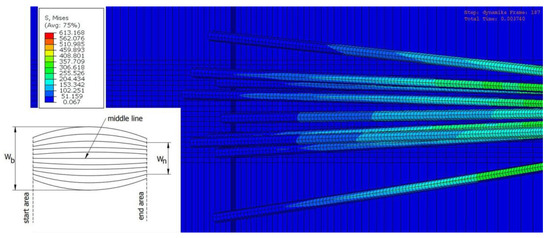 Figure 8 shows different phases of the passage of fibers through the surface defect obtained from the simulations conducted in Abaqus Explicit. In phase 1, the fibers glide across the surface of the workpiece, in phase 2 the first fibers fall into the groove (the fiber ends are below the line defining the workpiece surface), and in phase 3 the moment of first fibers hitting on the right slope of the surface defect occurs. As a result of the fibers passing below the line, defining the machined surface is an impact contact and smoothing of the slope of the surface defect, which can be seen in the real images taken with a microscope. On the other hand, in phase 4, the last fibers leave the defect area.