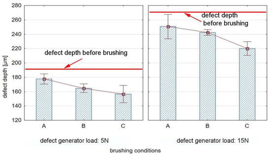 For the conditions denoted by A and B (Table 3), the reduction in the defect depth after brushing is visible; however, defects after brushing are slightly smaller than before brushing. The depth of the groove for the defect generator force of 5 N decreased by 18% and 25% for conditions A and B, respectively, while the depth of the groove for the defect generator force of 5 N decreased by 18% and 22% for conditions A and B, respectively. On the other hand, the use of a feed rate of vf = 370 mm/min and five brushing passes (conditions C), led to removing the defects from the surface of the workpiece.