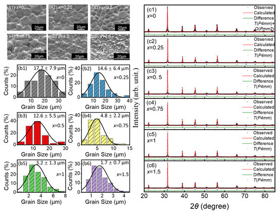 (a1–a6) SEM images and (b1–b6) normal distribution diagrams of the grain size statistics of BCZT-xSm (x = 0, 0.25, 0.5, 0.75, 1 and 1.5) ceramics; mean values and standard deviations are marked in the statistics diagram. XRD patterns and the Rietveld refinement of the XRD data for BCZT-xSm with (c1) x = 0, (c2) x = 0.25, (c3) x = 0.5, (c4) x = 0.75, (c5) x = 1, and (c6) x = 1.5.
