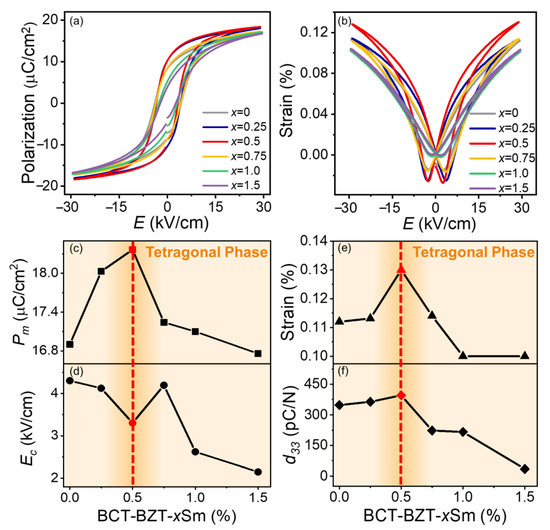 Figure 3a,b show the polarization-electric field (P-E) loops and electrostrain loops of the unmodified BCZT and BCZT-xSm ceramics at 30 kV/cm in the tetragonal-phase region, whose temperature was 10 °C higher than that of the T-O phase boundary. With increasing Sm doping concentration, the P-E loops and electrostrain curves became slim, indicating the miniaturization of the ferroelectric domains. To elucidate the changes in the ferroelectric, piezoelectric, and electromechanical properties after introducing Sm to the BCZT system, Figure 3c–f display the composition-dependent maximum polarization (Pm), coercive field (EC), strain, and piezoelectric coefficient (d33) in the single tetragonal phase. As shown in Figure 3c, the BCZT-0.5Sm ceramic exhibited an enhanced effect of the piezoelectric properties, which showed a larger Pm (18.37 µC/cm2), strain (0.13%), and d33 (396 pC/N) and a lower EC (3.30 kV/cm) compared with those of other ceramics. With the introduction of more Sm dopants (x = 1 and 1.5), the normal ferroelectric tetragonal phase gradually transformed to a relaxor state, leading to the degradation of the piezoelectric and ferroelectric properties. The above results indicated that the BCZT-0.5Sm ceramic exhibited an enhanced piezoelectric effect in a single ferroelectric phase.