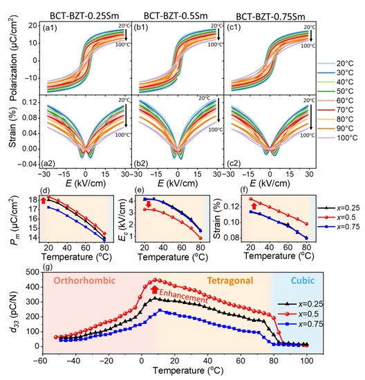 Furthermore, this enhancement effect could exist not only at room temperature, but also over a wide temperature range across the tetragonal phase. The temperature-dependent polarization-electric field (P-E) loops and electrostrain loops of the BCZT-xSm (x = 0.25, 0.5, 0.75) ceramics from 20 °C to 100 °C are shown in Figure 4a–c. Compared with the BCZT-0.25Sm and BCZT-0.75Sm ceramics, the BCZT-0.5Sm ceramic showed larger Pm and strain and lower EC upon heating (Figure 4d–f). Figure 4g presents the temperature-dependent piezoelectric coefficient d33 when heated from −20 °C to 100 °C. The d33 change of the BCZT-xSm ceramics peaked around 10 °C, indicating the T-O phase boundary [36]. With further heating, the d33 of the BCZT-0.5Sm ceramic was much larger than that of the BCZT-0.75Sm ceramic in the single-tetragonal-phase region. It is clear from the temperature-dependent results that the enhancement effect of the BCZT-0.5Sm ceramic in a single ferroelectric phase worked over a wide range of temperatures below TC.