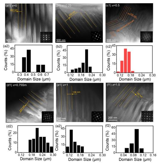 In order to reveal the enhanced piezoelectric effect of the Sm-modified BCZT ceramics, the microstructure of different compositions was probed from the (100) zone axis by transmission electron microscopy (TEM). Figure 5(a1–f1) show the ferroelectric domain structures and the corresponding average domain sizes of the BCZT-xSm (x = 0, 0.25, 0.5, 0.75, 1, and 1.5) ceramics [31,37] in Figure 5(a2–f2), respectively. Figure 5(b1,d1) display the lamellar domain patterns of the BCZT-0.25Sm and BCZT-0.75Sm ceramics, while for the BCZT-0.5Sm ceramic, the domain pattern showed a hierarchical structure, as shown in Figure 5(c1). Compared with the average domain size of the BCZT-0.25Sm (120 nm–240 nm) and BCZT-0.75Sm (160 nm–300 nm) ceramics, the average domain size of the BCZT-0.5Sm ceramic was the lowest (100 nm–200 nm).